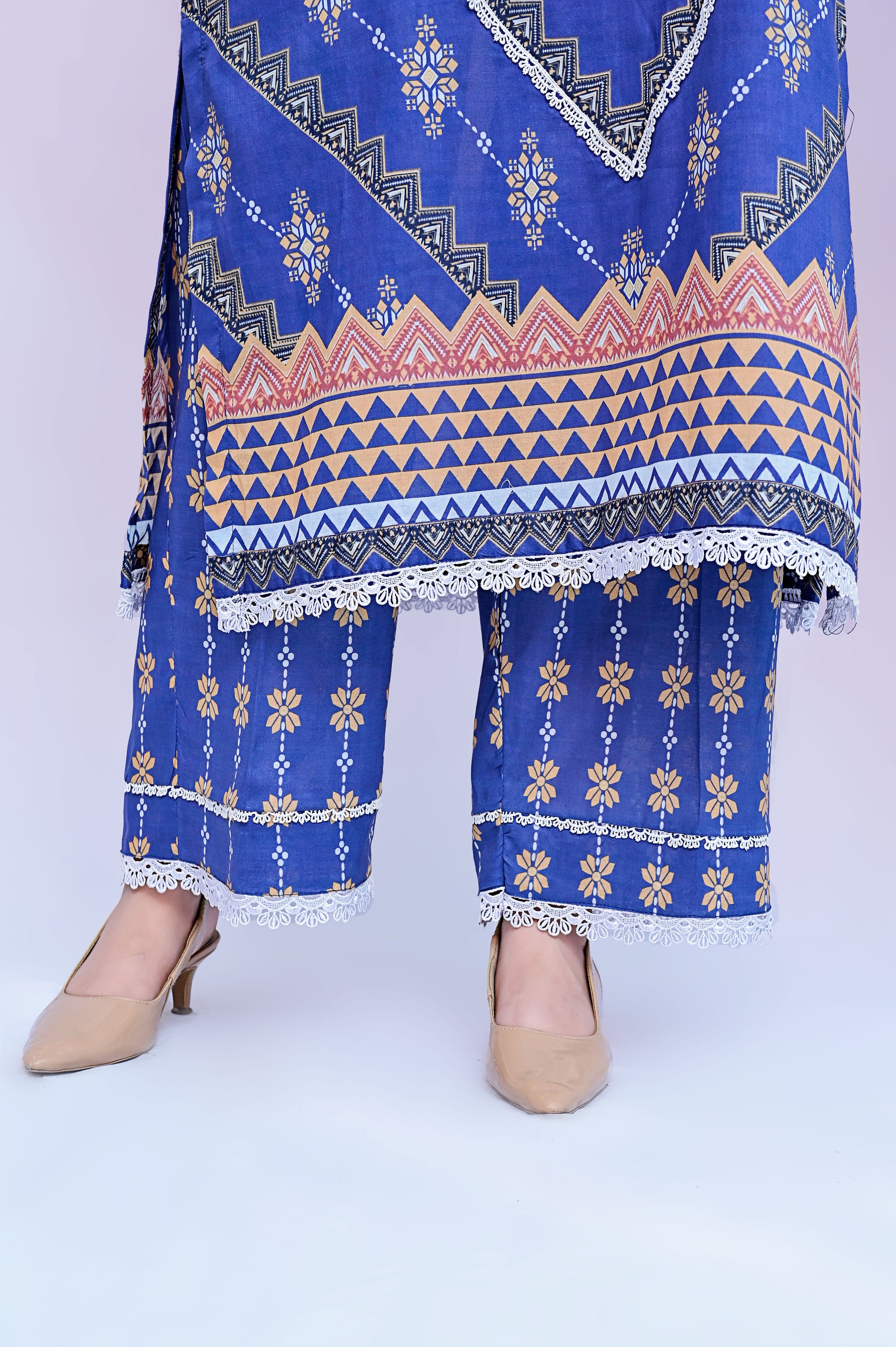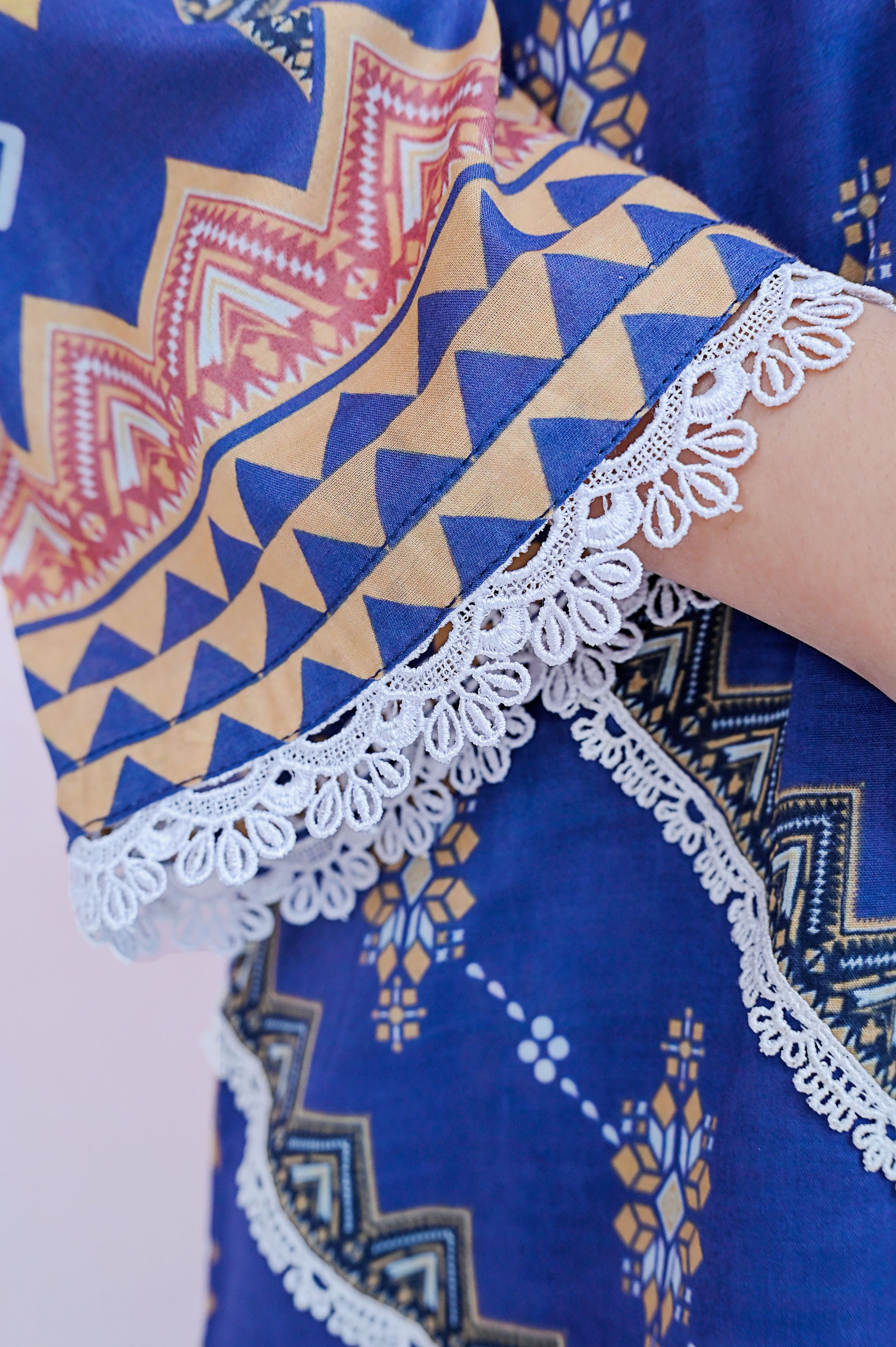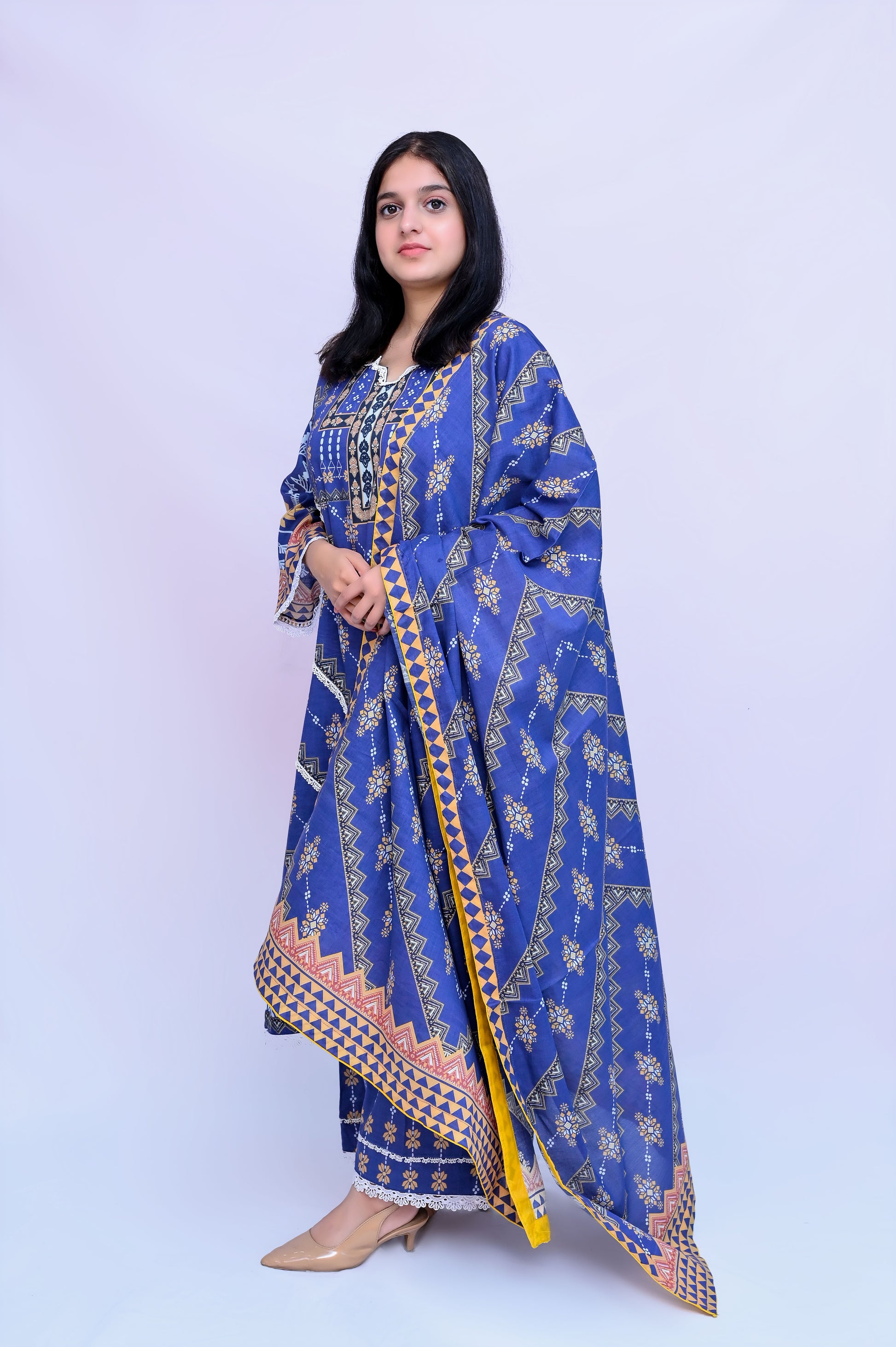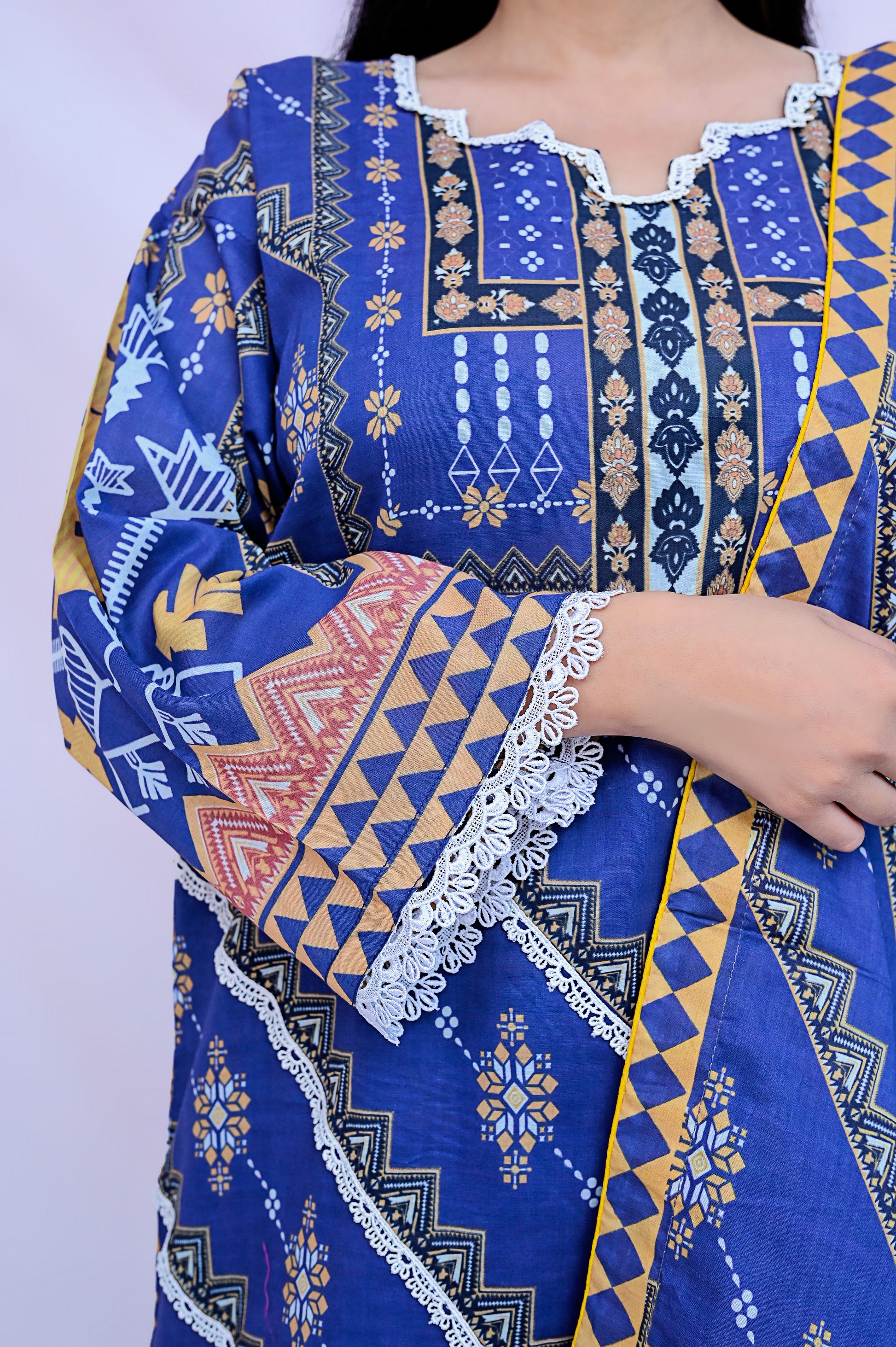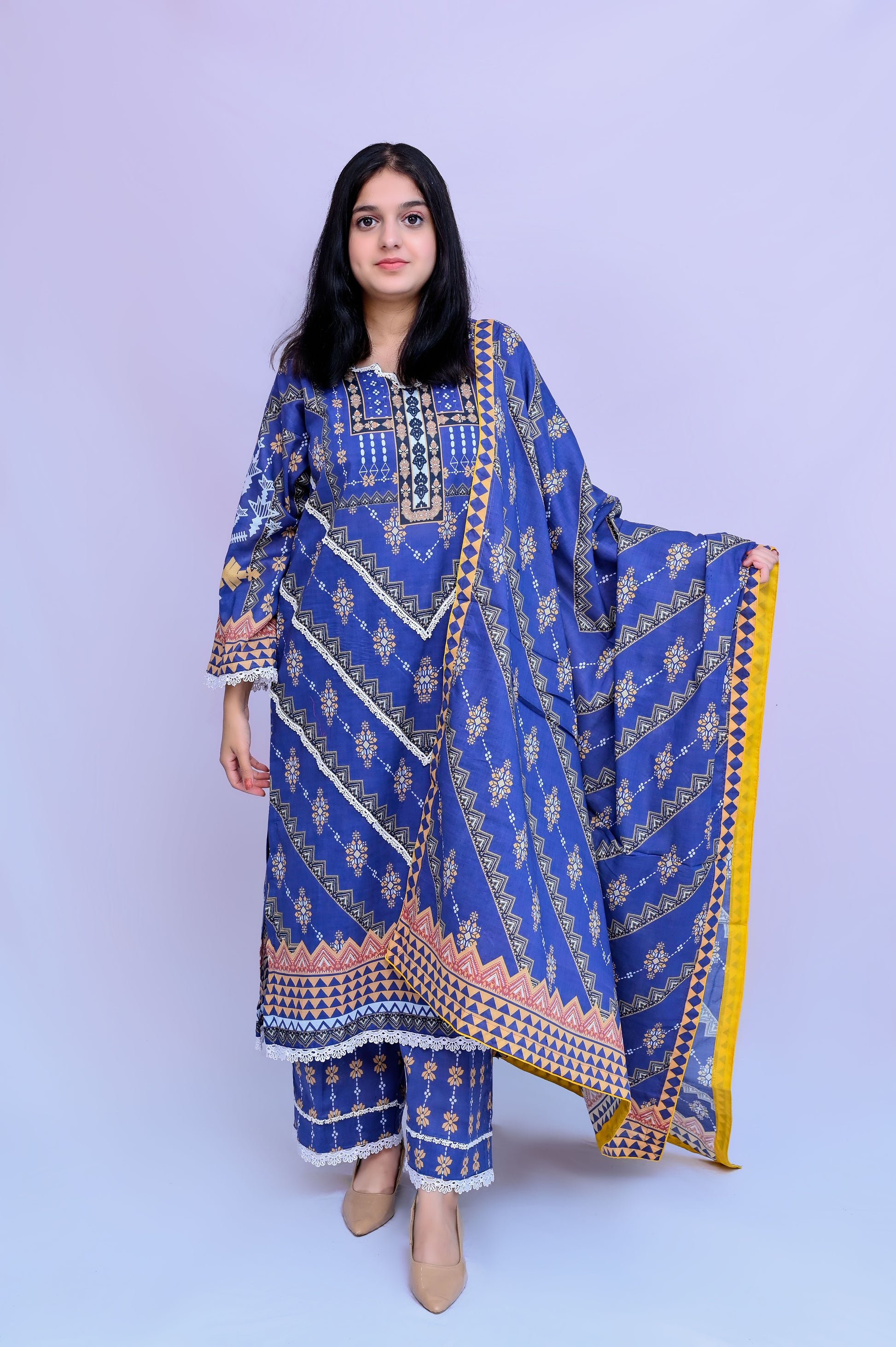 Radiate elegance in this striking Royal Blue Argyl lawn suit from Attires. Made with premium Summer lawn, the ensemble features bold digital prints inspired by traditional patterns, adding a rich ethnic touch to your look.