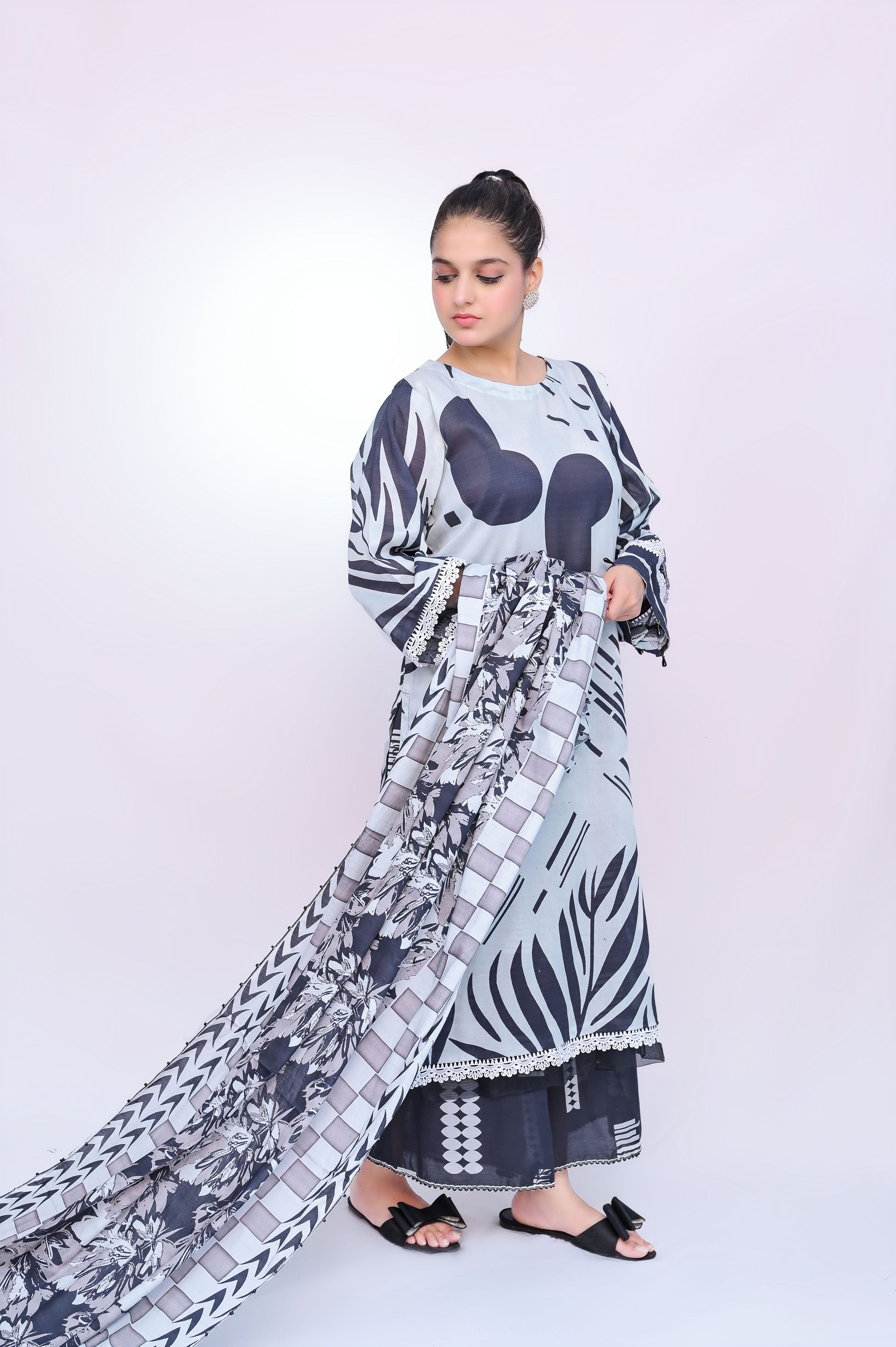 Chic and modern, this Dusty Lilac Western lawn suit by Attires blends soft tones with bold contrasts. Made from breathable Summer lawn, the outfit features striking digital prints in crisp white and black, giving it a contemporary edge while maintaining a feminine touch.