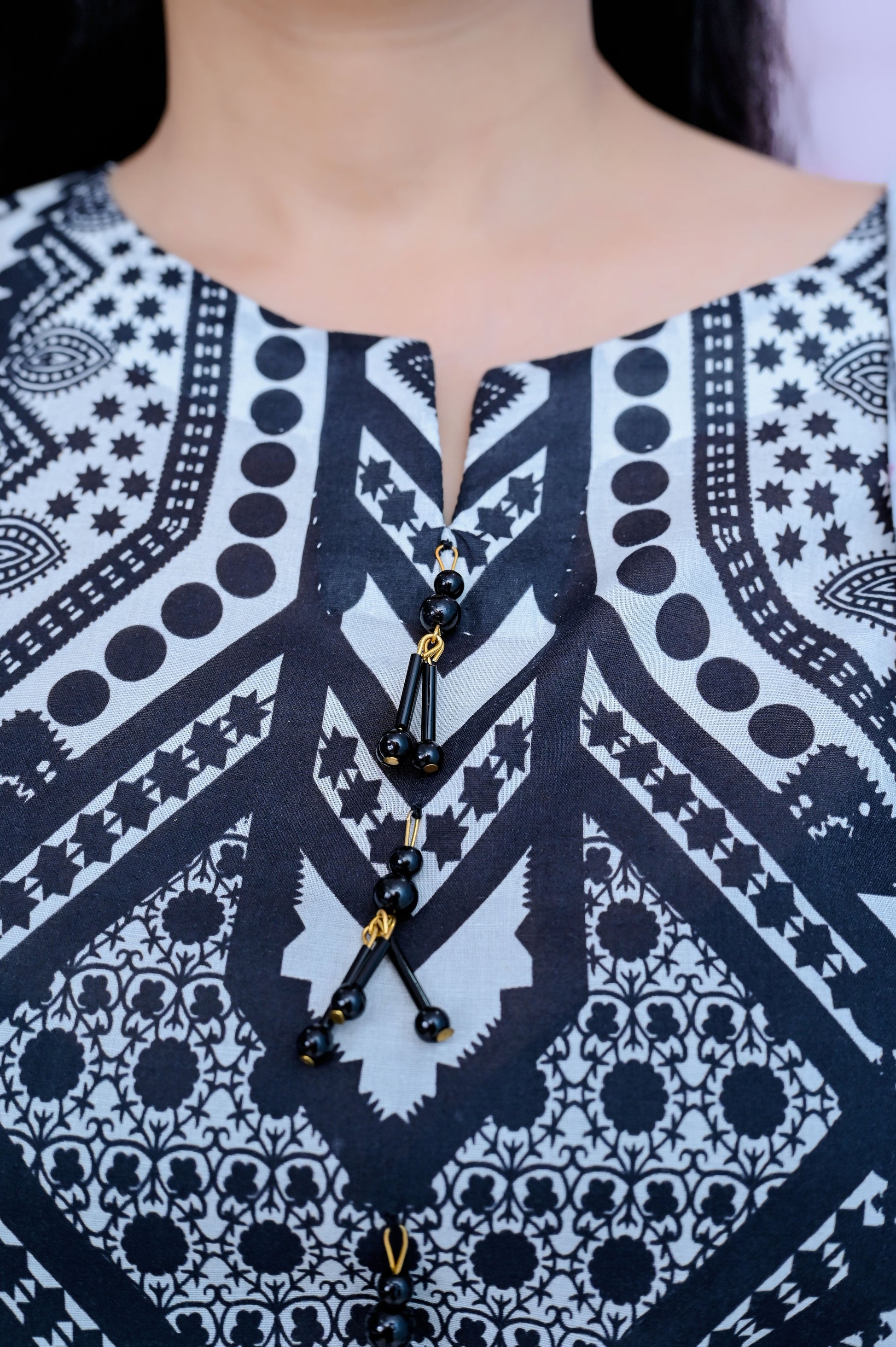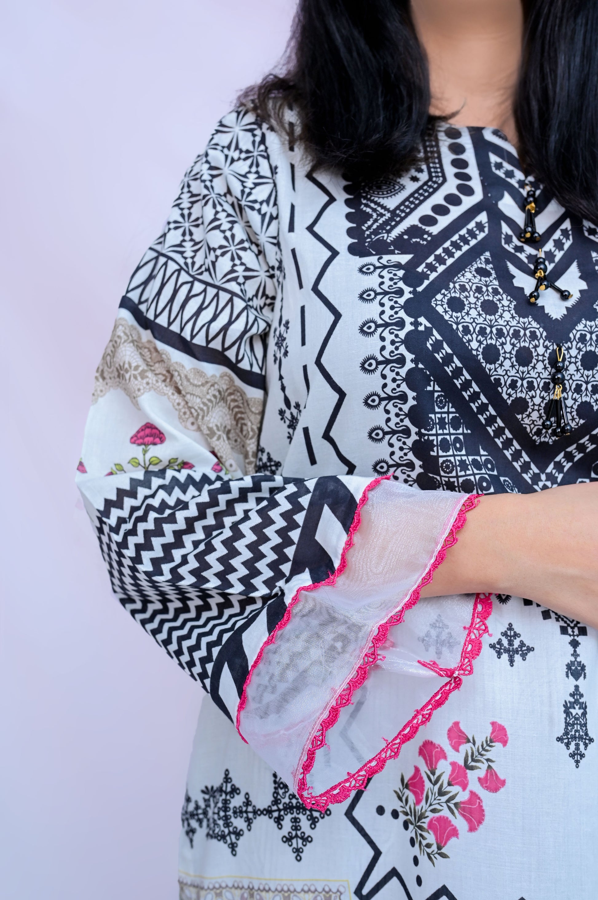 Paired with a matching wail dupatta adorned in complementing digital patterns and coordinated trousers, this ensemble is perfect for daytime events, casual gatherings, or a touch of everyday sophistication.