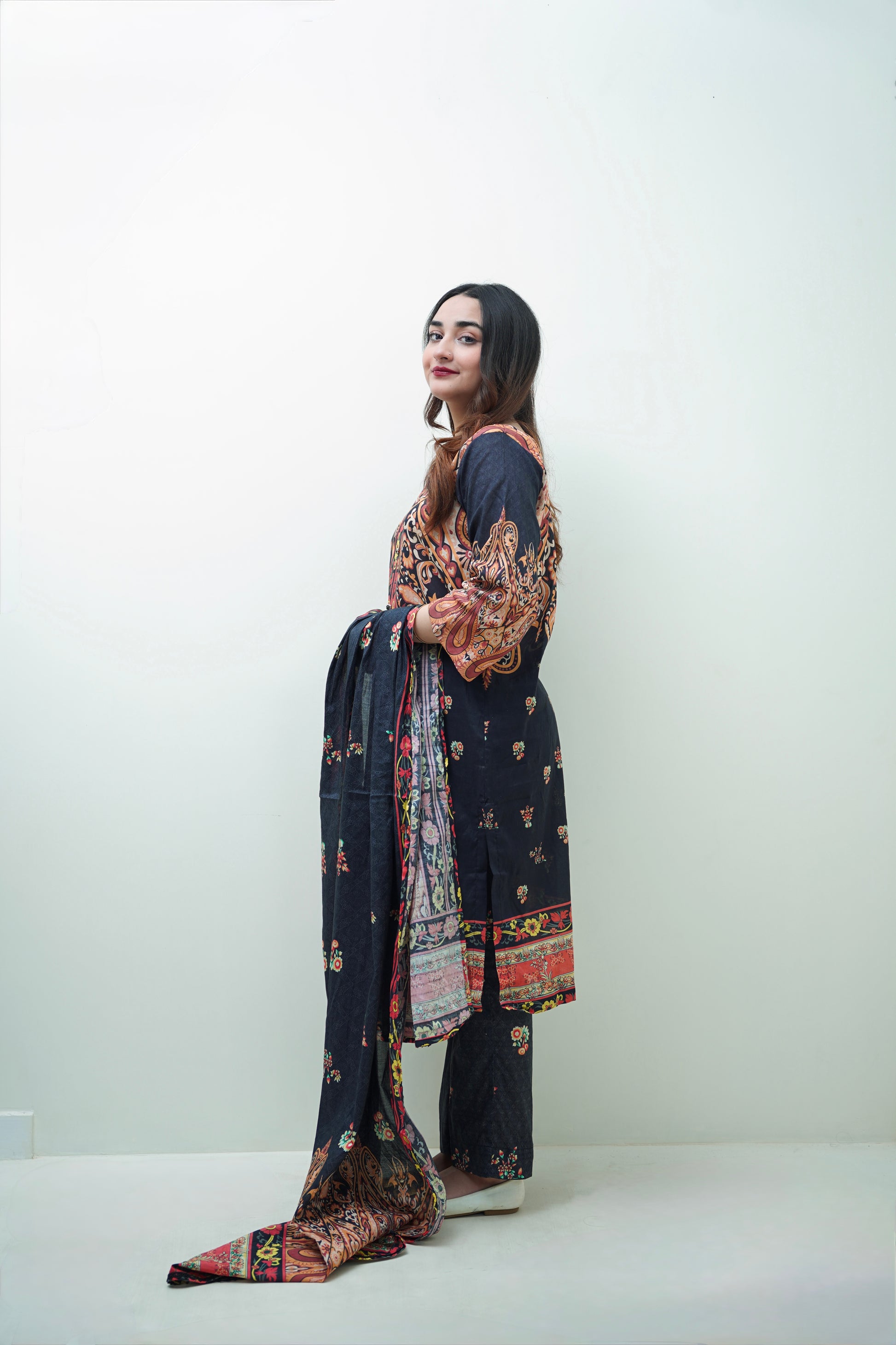 Step into effortless elegance with the Midnight Plumeria Lawn Suit by Attires. Crafted from breathable summer lawn, this striking black ensemble is adorned with digitally printed Plumeria flowers, their soft, radiant petals standing out beautifully against the deep, dark canvas.